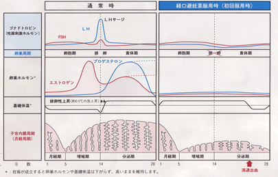 - 子宮内膜を変化させ、すりぬけ排卵等により万一受精したとしても受精卵が着床しにくい状態にする。